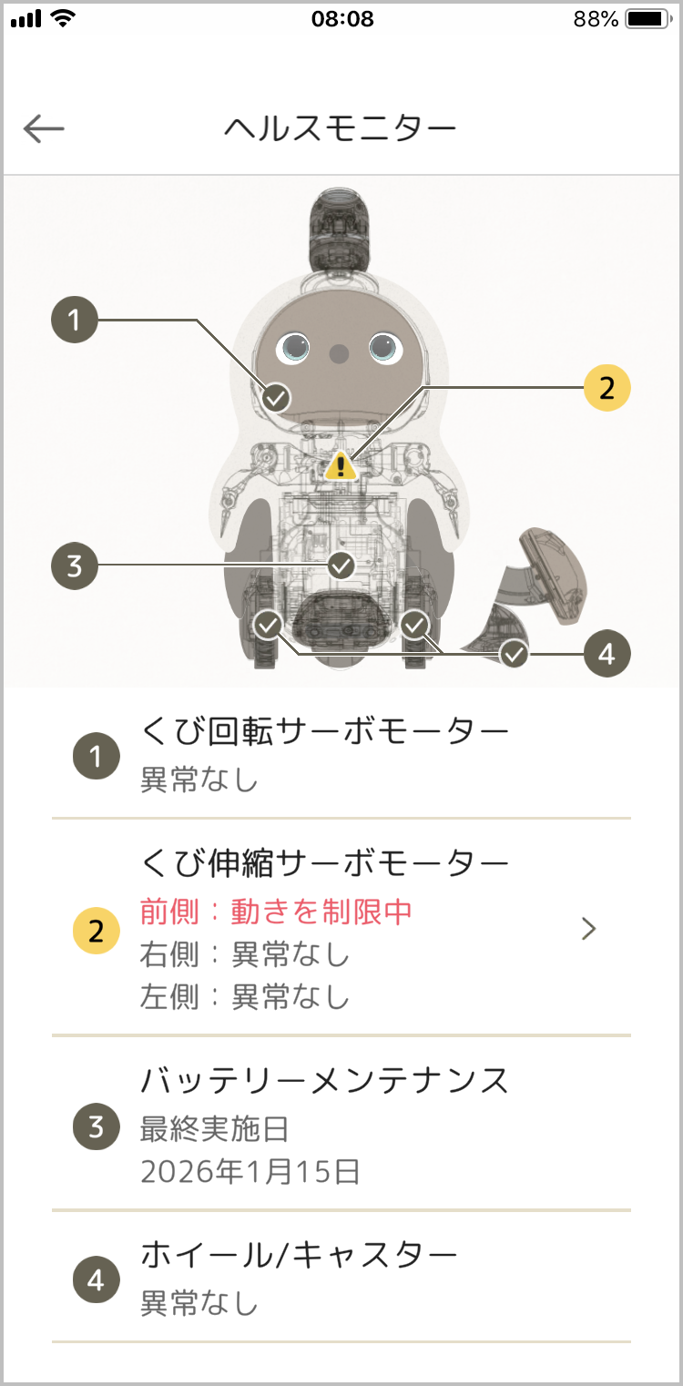 - 動きを制限中:くびを伸び縮みさせる動きを制限しています。くび伸縮サーボモーターが摩耗・損傷し正しく動かない状態のため、くびの動きを一部制限しています。例えば、くびをかしげる動き・うなずく動きなどが制限されます。