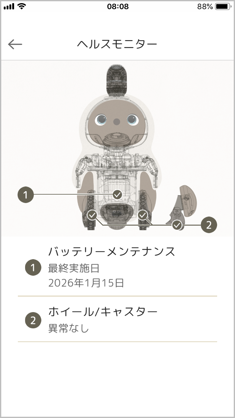 - 1週間以上情報が更新されていません:LOVOTの電源が切れている、インターネットに接続されていないなどの理由により、バッテリーメンテナンスの実施状況がわかりません。LOVOTの電源を入れて、インターネットに接続してください。