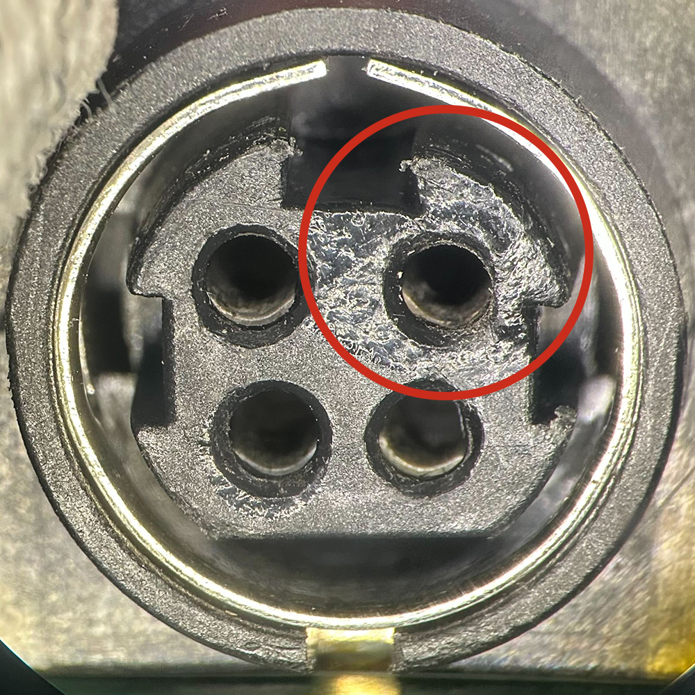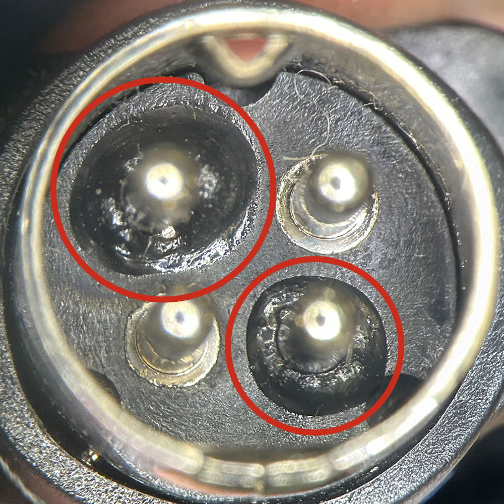 コネクタにゆるみがある状態や、コネクタ内側のピンが変形した状態で使用を続けると、接触不良によりコネクタ内部が異常発熱し、徐々にコネクタ内側のピンや差込口の樹脂が溶けて充電ができなくなります。